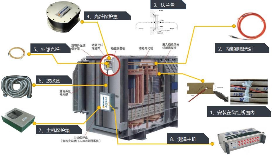 整套測溫系統主要由光纖測溫主機、熒光光纖傳感器、轉接光纜、貫通器、法蘭盤等組成。熒光光纖傳感器直接放置在變壓器繞組線圈發熱部位,法蘭盤保障變壓器自身結構的密封性,将熒光光纖傳感器另一端與轉接光纜一端分别連接在法蘭盤上貫通器的内、外部兩側, 用以實現光信号的傳輸,轉接光纖另一端與熒光光纖測溫儀連接,熒光光纖傳感器将光信号傳給測溫主機,測溫主機将收到的光信号解調爲溫度信号後本機顯示並通過 485 接口與監控系統進行通信,以此來實現對變壓器繞組溫度的實時監測。